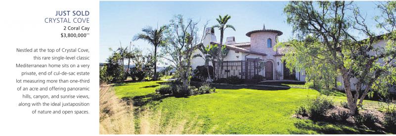 JUST SOLD CRYSTAL COVE 2 Coral Cay $3,800,000 ** Nestled at the top of Crystal Cove, this rare single-level classic Mediterranean home sits on a very private, end of cul-de-sac estate lot measuring more than one-third of an acre and offering panoramic hills, canyon, and sunrise views, along with the ideal juxtaposition of nature and open spaces.