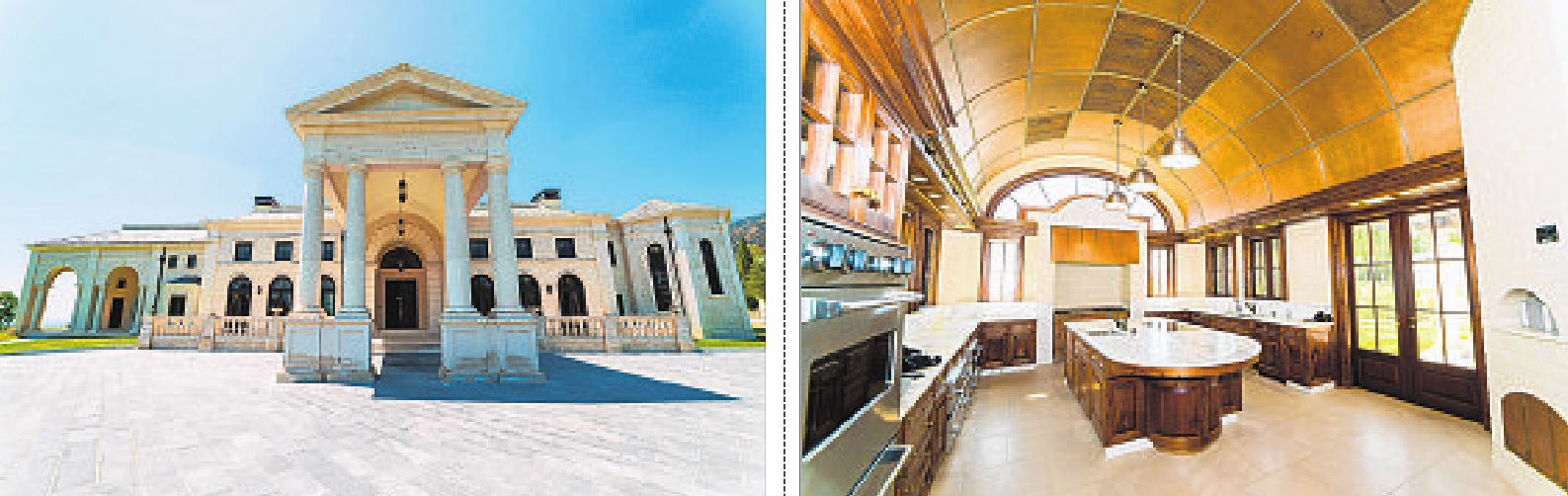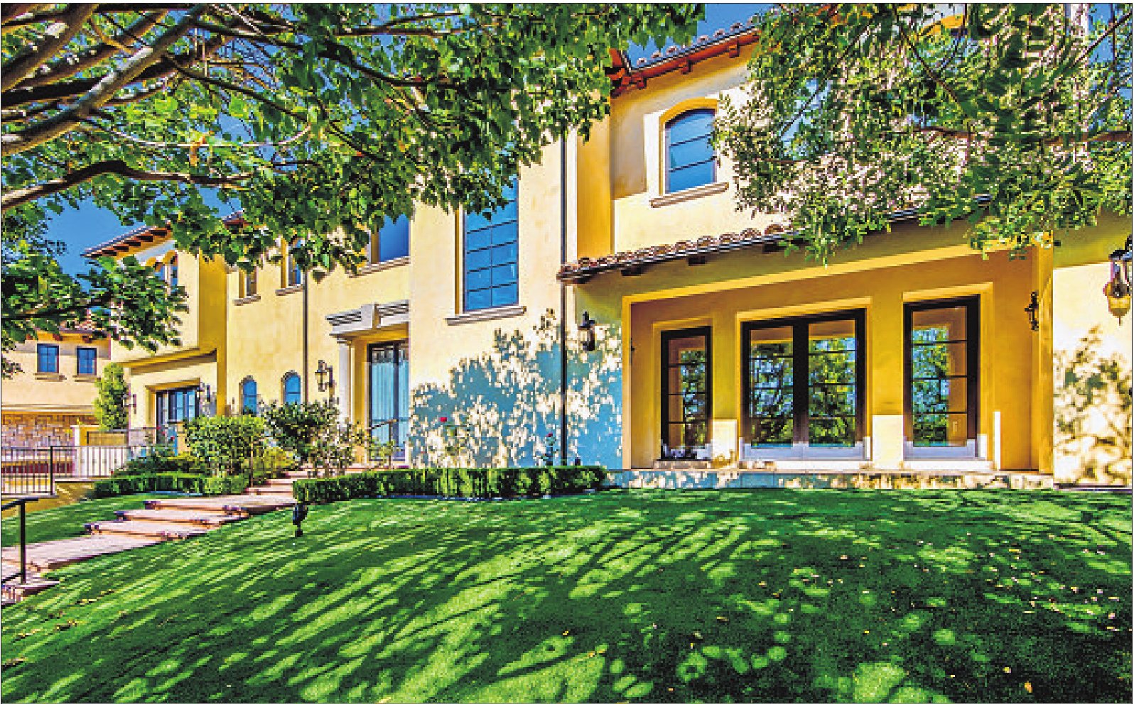 Tucked behind walls and gates, the 2.33-acre estate comprises a four-bedroom main house, a twostory guesthouse, a gym and a guardhouse. Lush gardens and palm trees fill the grounds, which include an amphitheater, terrace patios and an Italian stonerimmed swimming pool.