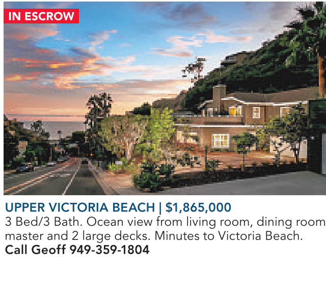 UPPER VICTORIA BEACH | $1,865,000 3 Bed/3 Bath. Ocean view from living room, dining room master and 2 large decks. Minutes to Victoria Beach. Call Geoff 949-359-1804