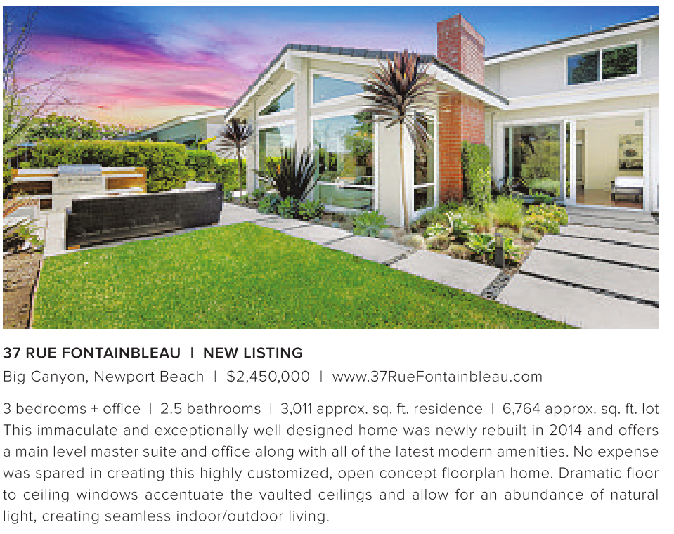 37 RUE FONTAINBLEAU | NEW LISTING Big Canyon, Newport Beach | $2,450,000 | www.37RueFontainbleau.com 3 bedrooms + office | 2.5 bathrooms | 3,011 approx. sq. ft. residence | 6,764 approx. sq. ft. lot This immaculate and exceptionally well designed home was newly rebuilt in 2014 and offers a main level master suite and office along with all of the latest modern amenities. No expense was spared in creating this highly customized, open concept floorplan home. Dramatic floor to ceiling windows accentuate the vaulted ceilings and allow for an abundance of natural light, creating seamless indoor/outdoor living.
