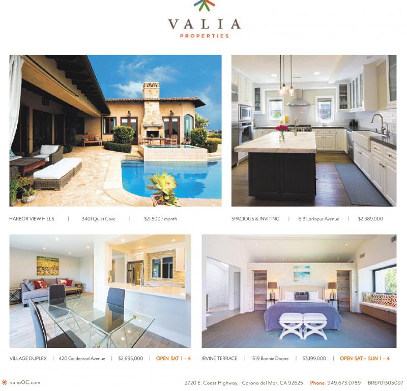 HARBOR VIEW HILLS | 3401 Quiet Cove | $21,500 /month SPACIOUS &INVITING | 613 Larkspur Avenue | $2,389,000 VILLAGE DUPLEX | 420 Goldenrod Avenue | $2,695,000 | OPEN SAT 1 - 4 IRVINE TERRACE | 1519 Bonnie Doone | $3,199,000 | OPEN SAT+ SUN 1 - 4 valiaOC.com 2720 E. Coast Highway, Corona del Mar, CA 92625 Phone 949.673.0789 BRE#01305097