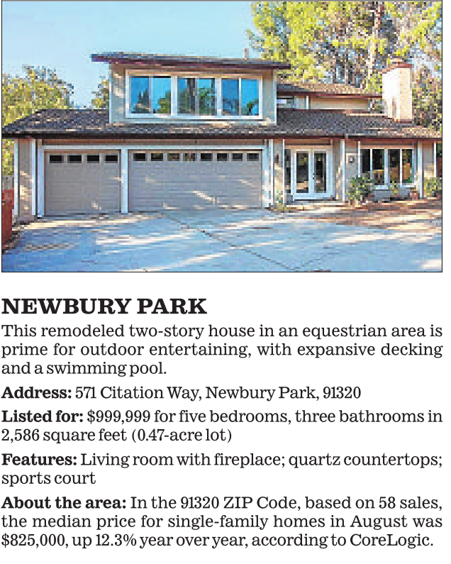 About the area: In the 91320 ZIP Code, based on 58 sales, the median price for single-family homes in August was $825,000, up 12.3% year over year, according to CoreLogic.