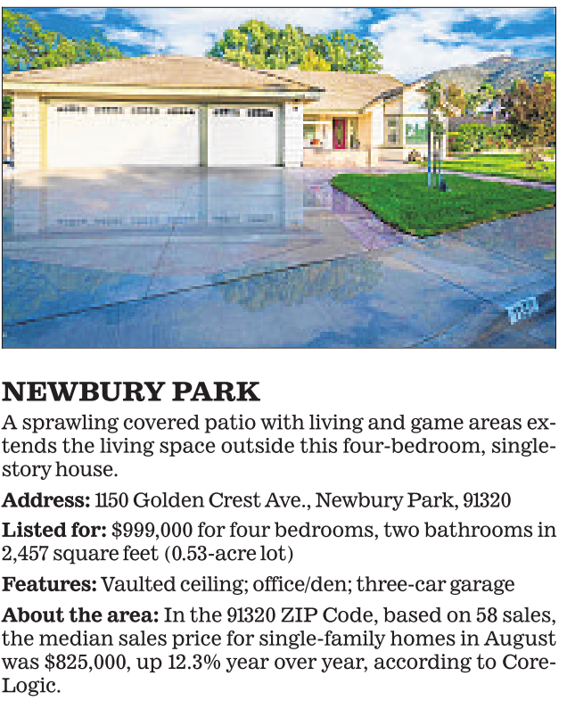 NEWBURY PARK Asprawling covered patio with living and game areas extends the living space outside this four-bedroom, singlestory house. Address:1150 Golden Crest Ave., Newbury Park, 91320 Listed for: $999,000 for four bedrooms, two bathrooms in 2,457 square feet (0.53-acre lot) Features: Vaulted ceiling; office/den; three-car garage About the area: In the 91320 ZIP Code, based on 58 sales, the median sales price for single-family homes in August was $825,000, up 12.3% year over year, according to Core- Logic. See also
