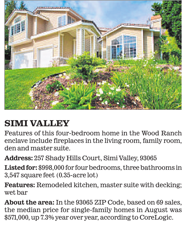 SIMI VALLEY Features of this four-bedroom home in the Wood Ranch enclave include fireplaces in the living room, family room, den and master suite. Address: 257 Shady Hills Court, Simi Valley, 93065 Listed for: $998,000 for four bedrooms, three bathrooms in 3,547 square feet (0.35-acre lot) Features: Remodeled kitchen, master suite with decking; wet bar About the area: In the 93065 ZIP Code, based on 69 sales, the median price for single-family homes in August was $571,000, up 7.3% year over year, according to CoreLogic. See also