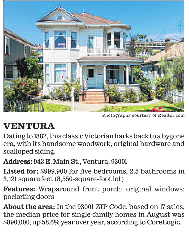 VENTURA Dating to1882, this classic Victorian harks back to a bygone era, with its handsome woodwork, original hardware and scalloped siding. Address: 943 E. Main St., Ventura, 93001 Photographs courtesy of Realtor.com Listed for: $999,900 for five bedrooms, 2.5 bathrooms in 3,121 square feet (8,550-square-foot lot) Features: Wraparound front porch; original windows; pocketing doors About the area: In the 93001 ZIP Code, based on 17 sales, the median price for single-family homes in August was $890,000, up 58.6% year over year, according to CoreLogic. See also