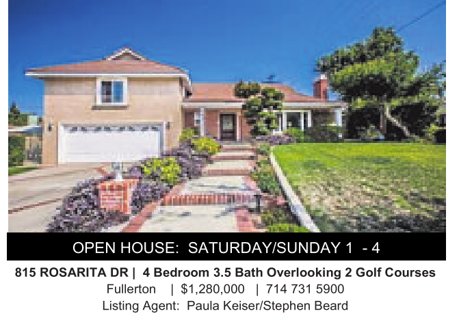 815 ROSARITA DR| 4Bedroom 3.5 Bath Overlooking 2Golf Courses Fullerton | $1,280,000 | 714 731 5900 Listing Agent: Paula Keiser/Stephen Beard