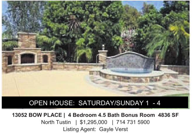 13052 BOW PLACE | 4Bedroom 4.5 Bath Bonus Room 4836 SF North Tustin | $1,295,000 | 714 731 5900 Listing Agent: Gayle Verst