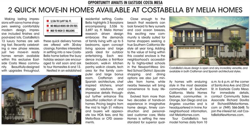 a.m. to 6 p.m. at the corner of SantaAna Ave. and 22nd St. in Eastside Costa Mesa. For immediate details, contact Community Sales Associate Richard Davilla at Richard@Melia-Homes. com or (949) 566-3648. To join the interest list,visit CostaBellaNewHomes.com.