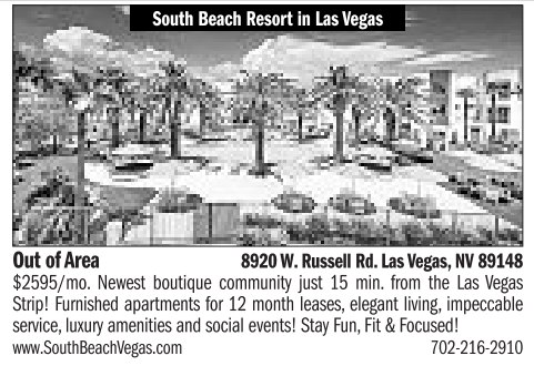 South Beach ResortinLas Vegas Out of Area 8920 W. RussellRd. Las Vegas, NV 89148 $2595/mo. Newest boutique community just 15 min. from the Las Vegas Strip! Furnished apartments for 12 month leases, elegant living,impeccable service, luxury amenities and social events! Stay Fun, Fit&Focused! www.SouthBeachVegas.com 702-216-2910