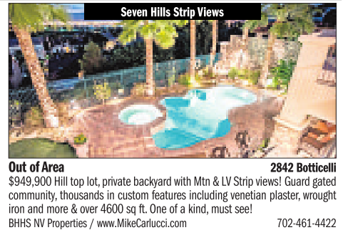 Out of Area 2842 Botticelli $949,900 Hill top lot,private backyard with Mtn &LVStrip views! Guard gated community,thousands in custom features including venetian plaster,wrought iron and more &over 4600 sq ft. One of akind, must see! BHHSNVProperties /www.MikeCarlucci.com 702-461-4422