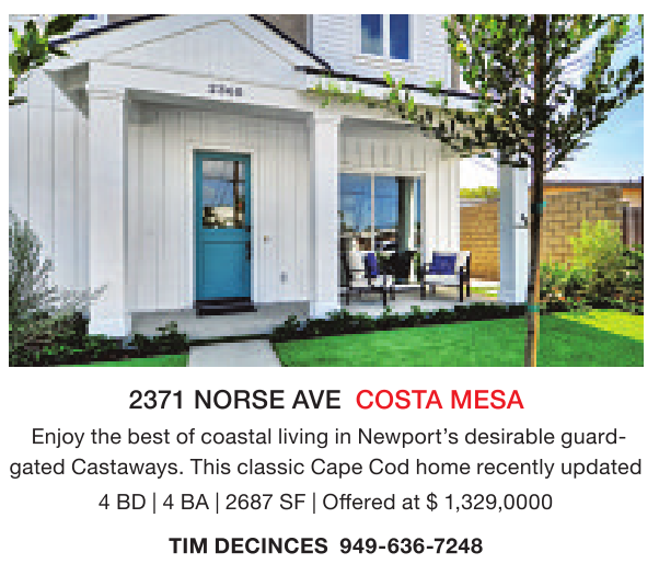 2371 NORSE AVE COSTA MESA Enjoy the best of coastal living inNewport’s desirable guardgated Castaways. This classic Cape Cod home recently updated 4BD|4BA |2687 SF|Offered at $1,329,0000