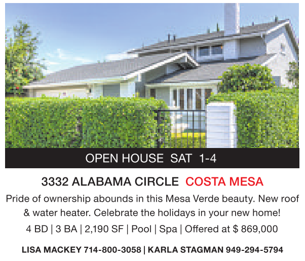 OPEN HOUSE SAT 1-4 3332 ALABAMA CIRCLE COSTA MESA Pride ofownership abounds in this Mesa Verde beauty. New roof &water heater. Celebrate the holidays inyour new home! 4BD|3BA |2,190 SF |Pool |Spa |Offered at $869,000 LISA MACKEY 714-800-3058 |KARLA STAGMAN 949-294-5794