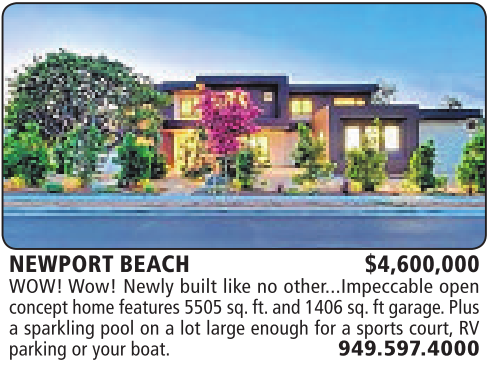 NEWPORT BEACH $4,600,000 WOW! Wow! Newly built like no other...Impeccable open concept homefeatures5505 sq. ft. and 1406sq. ft garage.Plus a sparkling pool on a lot large enough for a sports court, RV parking or your boat. 949.597.4000