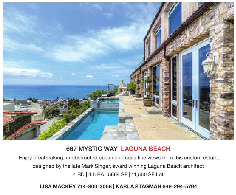 667 MYSTIC WAY LAGUNA BEACH Enjoy breathtaking, unobstructed ocean and coastline views from this custom estate, designed by the late Mark Singer, award winning Laguna Beach architect 4BD|4.5 BA|5664 SF |11,550 SFLot LISA MACKEY 714-800-3058 |KARLA STAGMAN 949-294-5794