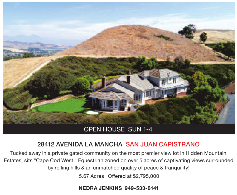 OPEN HOUSE SUN 1-4 28412 AVENIDA LA MANCHA SAN JUAN CAPISTRANO Tucked away in aprivate gated community on the most premier view lot in Hidden Mountain Estates, sits "Cape Cod West." Equestrian zoned onover 5acres ofcaptivating views surrounded by rolling hills &anunmatched quality of peace &tranquility! 5.67 Acres |Offered at $2,795,000 NEDRA JENKINS 949-533-8141