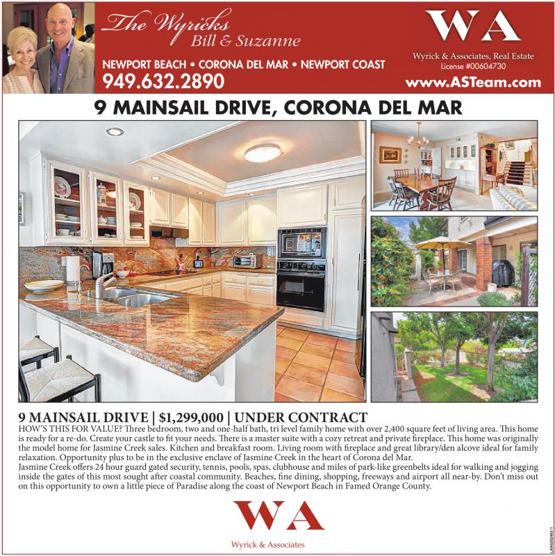 The Wyricks Bill & Suzanne NEWPORT BEACH • CORONA DEL MAR • NEWPORT COAST 949.632.2890 www.ASTeam.com 9 MAINSAIL DRIVE, CORONA DEL MAR Wyrick & Associates, Real Estate License #00604730 9 MAINSAIL DRIVE | $1,299,000 | UNDER CONTRACT HOW’S THIS FOR VALUE? Three bedroom, two and one-half bath, tri level family home with over 2,400 square feet of living area. This home is ready for a re-do. Create your castle to fit your needs. There is a master suite with a cozy retreat and private fireplace. This home was originally the model home for Jasmine Creek sales. Kitchen and breakfast room. Living room with fireplace and great library/den alcove ideal for family relaxation. Opportunity plus to be in the exclusive enclave of Jasmine Creek in the heart of Corona del Mar. Jasmine Creek offers 24 hour guard gated security, tennis, pools, spas, clubhouse and miles of park-like greenbelts ideal for walking and jogging inside the gates of this most sought after coastal community. Beaches, fine dining, shopping, freeways and airport all near-by. Don’t miss out on this opportunity to own a little piece of Paradise along the coast of Newport Beach in Famed Orange County.