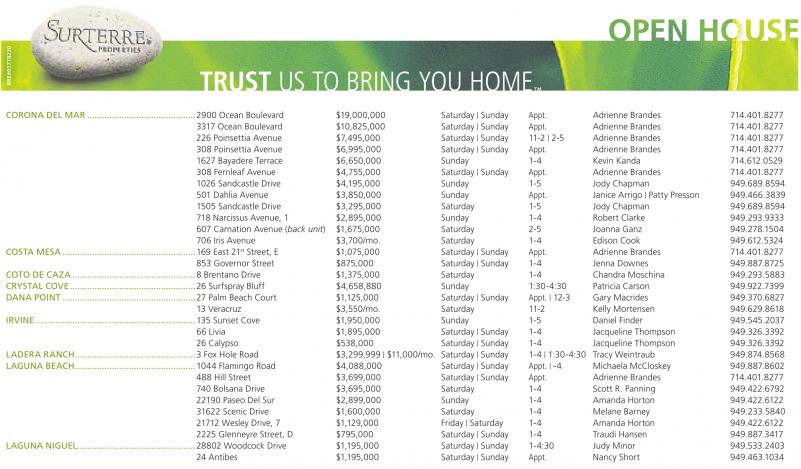 CORONA DEL MAR ............................................2900 Ocean Boulevard $19,000,000 Saturday | Sunday Appt. Adrienne Brandes 714.401.8277 3317 Ocean Boulevard $10,825,000 Saturday | Sunday Appt. Adrienne Brandes 714.401.8277 226 Poinsettia Avenue $7,495,000 Saturday | Sunday 11-2 | 2-5 Adrienne Brandes 714.401.8277 308 Poinsettia Avenue $6,995,000 Saturday | Sunday Appt. Adrienne Brandes 714.401.8277 1627 Bayadere Terrace $6,650,000 Sunday 1-4 Kevin Kanda 714.612.0529 308 Fernleaf Avenue $4,755,000 Saturday | Sunday Appt. Adrienne Brandes 714.401.8277 1026 Sandcastle Drive $4,195,000 Sunday 1-5 Jody Chapman 949.689.8594 501 Dahlia Avenue $3,850,000 Sunday Appt. Janice Arrigo | Patty Presson 949.466.3839 1505 Sandcastle Drive $3,295,000 Saturday 1-5 Jody Chapman 949.689.8594 718 Narcissus Avenue, 1 $2,895,000 Sunday 1-4 Robert Clarke 949.293.9333 607 Carnation Avenue (back unit) $1,675,000 Saturday 2-5 Joanna Ganz 949.278.1504 706 Iris Avenue $3,700/mo. Saturday 1-4 Edison Cook 949.612.5324 COSTA MESA......................................................169 East 21 st Street, E $1,075,000 Saturday | Sunday Appt. Adrienne Brandes 714.401.8277 853 Governor Street $875,000 Saturday | Sunday 1-4 Jenna Downes 949.887.8725 COTO DE CAZA..................................................8 Brentano Drive $1,375,000 Saturday 1-4 Chandra Moschina 949.293.5883 CRYSTAL COVE...................................................26 Surfspray Bluff $4,658,880 Sunday 1:30-4:30 Patricia Carson 949.922.7399 DANA POINT ......................................................27 Palm Beach Court $1,125,000 Saturday | Sunday Appt. | 12-3 Gary Macrides 949.370.6827 13 Veracruz $3,550/mo. Saturday 11-2 Kelly Mortensen 949.629.8618 IRVINE .................................................................135 Sunset Cove $1,950,000 Sunday 1-5 Daniel Finder 949.545.2037 66 Livia $1,895,000 Saturday | Sunday 1-4 Jacqueline Thompson 949.326.3392 26 Calypso $538,000 Saturday | Sunday 1-4 Jacqueline Thompson 949.326.3392 LADERA RANCH.................................................3 Fox Hole Road $3,299,999 | $11,000/mo. Saturday | Sunday 1-4 | 1:30-4:30 Tracy Weintraub 949.874.8568 LAGUNA BEACH.................................................1044 Flamingo Road $4,088,000 Saturday | Sunday Appt. | -4 Michaela McCloskey 949.887.8602 488 Hill Street $3,699,000 Saturday | Sunday Appt. Adrienne Brandes 714.401.8277 740 Bolsana Drive $3,695,000 Saturday 1-4 Scott R. Panning 949.422.6792 22190 Paseo Del Sur $2,899,000 Sunday 1-4 Amanda Horton 949.422.6122 31622 Scenic Drive $1,600,000 Saturday 1-4 Melane Barney 949.233.5840 21712 Wesley Drive, 7 $1,129,000 Friday | Saturday 1-4 Amanda Horton 949.422.6122 2225 Glenneyre Street, D $795,000 Saturday | Sunday 1-4 Traudi Hansen 949.887.3417 LAGUNA NIGUEL................................................28802 Woodcock Drive $1,195,000 Saturday | Sunday 1-4:30 Judy Minor 949.533.2403 24 Antibes $1,195,000 Saturday | Sunday Appt. Nancy Short 949.463.1034