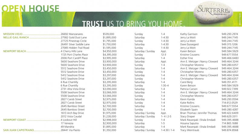 MISSION VIEJO...................................................26692 Manzanares $539,000 Sunday 1-4 Kathy Garrison 949.293.2974 NELLIE GAIL RANCH ..........................................27582 Gold Dust Lane $1,895,000 Saturday 1-4:30 Jerry La Mott 949.244.7145 27725 Pinestrap Circle $1,795,000 Sunday 1-4:30 Jerry La Mott 949.244.7145 26491 Silver Saddle Lane $1,750,000 Saturday 1-4:30 Dave Dyssegard 949.315.1206 27085 Hidden Trail Road $1,595,000 Sunday 1-4:30 Jerry La Mott 949.244.7145 NEWPORT BEACH ..............................................4 Cherry Hills Lane $4,950,000 Saturday | Sunday Appt. Karen Betson 949.584.5929 1725 Port Charles Place $4,395,000 Sunday 12-3 Kristine Cousens 949.677.5554 2006 Port Cardiff Place $3,995,000 Saturday 1-4 Esther Fine 949.466.6483 5600 Seashore Drive $3,900,000 Saturday Appt. Ann E. Metzger | Nancy Cloward 949.464.3244 5600 Seashore Drive $3,900,000 Sunday 1-4 Christopher Moreno 949.280.6357 5512 Seashore Drive $3,450,000 Saturday 1-4 Ann E. Metzger | Nancy Cloward 949.464.3244 5512 Seashore Drive $3,450,000 Sunday 1-4 Christopher Moreno 949.280.6357 5412 Seashore Drive $3,297,000 Saturday 1-4 Ann E. Metzger | Nancy Cloward 949.464.3244 5412 Seashore Drive $3,297,000 Sunday 1-4 Christopher Moreno 949.280.6357 6 Rue Chantilly $3,295,000 Saturday 1-4 Carol Berg 949.351.4171 6 Rue Chantilly $3,295,000 Sunday 1:30-4 Karen Betson 949.584.5929 2731 Alta Vista Drive $3,090,000 Saturday 1-4 Patricia Carson 949.922.7399 5508 Seashore Drive $3,066,000 Saturday 1-4 Ann E. Metzger | Nancy Cloward 949.464.3244 5508 Seashore Drive $3,066,000 Sunday 1-4 Christopher Moreno 949.280.6357 2827 Carob Street $2,975,000 Saturday 1-4 Kevin Kanda 949.293.0594 2827 Carob Street $2,975,000 Sunday 1-4 Katie Rollins 714.612.0529 2645 Bamboo Street $2,700,000 Saturday 1-4 Kristine Cousens 949.677.5554 2645 Bamboo Street $2,700,000 Sunday 1-4 Elizabeth Spain 949.280.4287 1613 Arch Bay Drive $1,975,000 Saturday | Sunday Appt. Brian Thomas | Jennifer Thomas 949.422.6409 2012 Vista Caudal $1,228,000 Saturday | Sunday 1- 4 | 2-5 Stacy Draper 949.629.3311 NEWPORT COAST ..............................................4 Lookout Hill $2,998,000 Sunday 1-4 Mark Ravanpak | Shala Emdadi 949.395.4688 17 Venezia $2,900,000 Saturday 1-5 Hosana Saputra 714.865.1688 49 Mandria $1,895,000 Saturday 1-4 Mark Ravanpak | Shala Emdadi 949.395.4688 SAN JUAN CAPISTRANO....................................28441 Via Pasito $1,350,000 Saturday | Sunday 1-4:30 | 1-4 Tracy Weintraub 949.874.8568