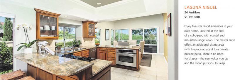 LAGUNA NIGUEL 24 Antibes $1,195,000 Enjoy five-star resort amenities in your own home. Located at the end of a cul-de-sac with coastal and mountain range views. The master suite offers an additional sitting area with fireplace adjacent to a private outside patio. There is no need for drapes—the sun wakes you up and the moon puts you to sleep.