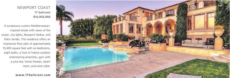 NEWPORT COAST 17 Sailcrest $16,950,000 A sumptuous custom Mediterraneaninspired estate with views of the ocean, city lights, Newport Harbor, and Palos Verdes. This residence offers an impressive floor plan of approximately 10,400 square feet with six bedrooms, eight baths, a host of indoor-outdoor entertaining amenities, gym with a juice bar, home theater, steam room, and wine cellar. www.17Sailcrest.com See also