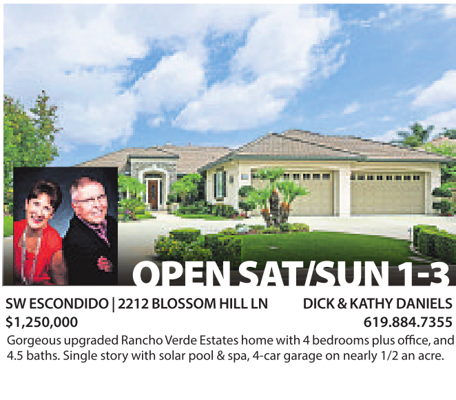 SW ESCONDIDO |2212 BLOSSOM HILL LN DICK &KATHY DANIELS $1,250,000 619.884.7355 Gorgeous upgraded Rancho VerdeEstates home with 4bedrooms plus office,and 4.5 baths.Single storywithsolar pool&spa, 4-car garage on nearly 1/2 an acre.
