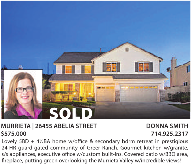 SOLD MURRIETA |26455 ABELIA STREET DONNA SMITH $575,000 714.925.2317 Lovely 5BD + 4½BA home w/office & secondary bdrm retreat in prestigious 24-HR guard-gated community of Greer Ranch. Gourmet kitchen w/granite, s/s appliances, executive office w/custom built-ins. Covered patio w/BBQ area, fireplace, puttinggreen overlookingthe Murrieta Valley w/incredible views!