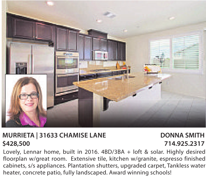 MURRIETA |31633 CHAMISE LANE DONNA SMITH $428,500 714.925.2317 Lovely, Lennar home, built in 2016. 4BD/3BA + loft & solar. Highly desired floorplan w/great room. Extensive tile, kitchen w/granite, espresso finished cabinets, s/s appliances. Plantation shutters, upgraded carpet, Tankless water heater, concrete patio, fully landscaped. Award winning schools!