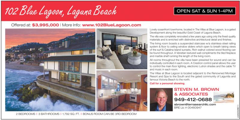102 Blue Lagoon, Laguna Beach OPEN SAT & SUN 1-4PM Offered at: $3,995,000 | More Info: www.102BlueLagoon.com 2 BEDROOMS | 3 BATHROOMS | 1,792 SQ. FT. | BONUS ROOM CAN BE 3RD BEDROOM Lovely oceanfront townhome, located in The Villas at Blue Lagoon, is agated Development along the beautiful Gold Coast of Laguna Beach. The villawas completely renovated afew years ago using onlythe finest quality materials and is enriched with distinctive architectural detail and finishes. The living room boasts a suspended staircase w/a stainless-steel railing system & floor to ceiling window sliders which open to breath taking views of the surf & Catalina Island sunsets. Rich walnut colored wood flooring can be found throughout. AVenetian textured wall compliments the tiled fireplace and marble shelf running the length of the living room. All rooms throughout the villa have been prewired for sound and can be individually controlled in each room. ACrestron control panel allows the user to control the main floor lighting, electronic Lutron shades and the cable TV and music in each room. The Villas at Blue Lagoon is located adjacent to the Renowned Montage Resort and Spa to the South and the gated community of Lagunita and famous Victoria Beach to the north. Call for a personal showing. STEVEN M. BROWN & ASSOCIATES 949-412-0688 sbrown@terrasearchllc.com BRE Lic # 00460947