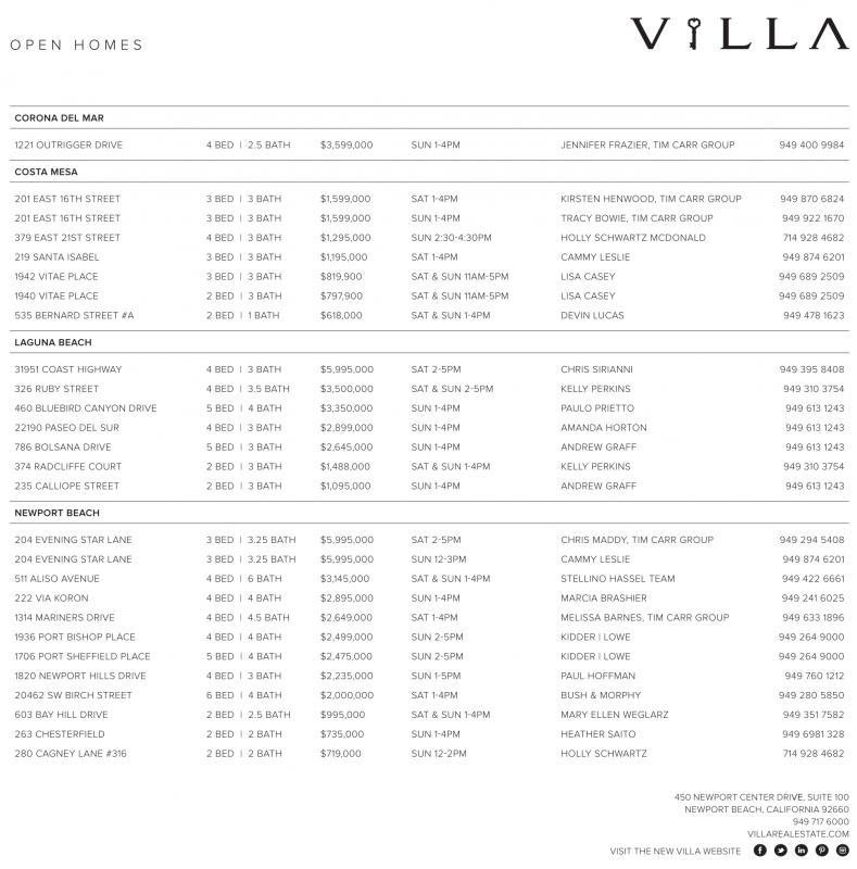 201 EAST 16TH STREET 3 BED | 3 BATH $1,599,000 SAT 1-4PM KIRSTEN HENWOOD, TIM CARR GROUP 949 870 6824 201 EAST 16TH STREET 3 BED | 3 BATH $1,599,000 SUN 1-4PM TRACY BOWIE, TIM CARR GROUP 949 922 1670 379 EAST 21ST STREET 4 BED | 3 BATH $1,295,000 SUN 2:30-4:30PM HOLLY SCHWARTZ MCDONALD 714 928 4682 219 SANTA ISABEL 3 BED | 3 BATH $1,195,000 SAT 1-4PM CAMMY LESLIE 949 874 6201 1942 VITAE PLACE 3 BED | 3 BATH $819,900 SAT & SUN 11AM-5PM LISA CASEY 949 689 2509 1940 VITAE PLACE 2 BED | 3 BATH $797,900 SAT & SUN 11AM-5PM LISA CASEY 949 689 2509 535 BERNARD STREET #A 2 BED | 1 BATH $618,000 SAT & SUN 1-4PM DEVIN LUCAS 949 478 1623