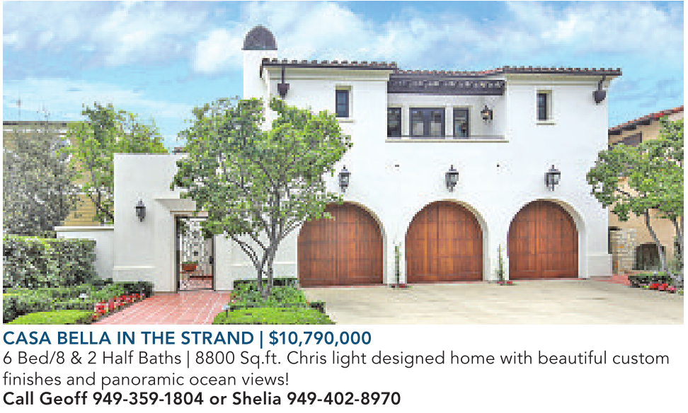 CASA BELLA IN THE STRAND | $10,790,000 6 Bed/8 & 2 Half Baths | 8800 Sq.ft. Chris light designed home with beautiful custom finishes and panoramic ocean views! Call Geoff 949-359-1804 or Shelia 949-402-8970