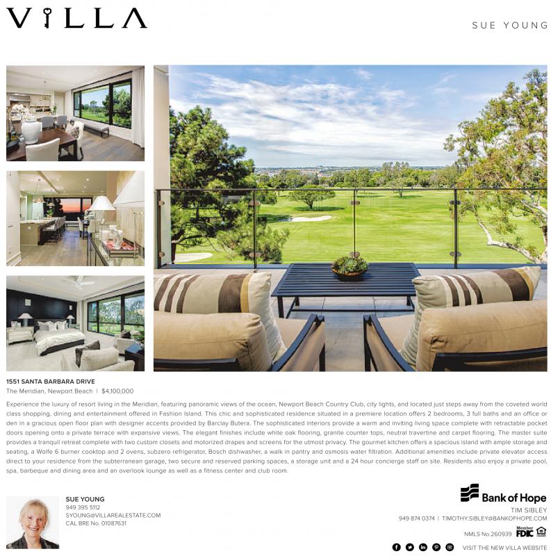 S U E Y O U N G 1551 SANTA BARBARA DRIVE The Meridian, Newport Beach | $4,100,000 Experience the luxury of resort living in the Meridian, featuring panoramic views of the ocean, Newport Beach Country Club, city lights, and located just steps away from the coveted world class shopping, dining and entertainment offered in Fashion Island. This chic and sophisticated residence situated in a premiere location offers 2 bedrooms, 3 full baths and an office or den in a gracious open floor plan with designer accents provided by Barclay Butera. The sophisticated interiors provide a warm and inviting living space complete with retractable pocket doors opening onto a private terrace with expansive views. The elegant finishes include white oak flooring, granite counter tops, neutral travertine and carpet flooring. The master suite provides a tranquil retreat complete with two custom closets and motorized drapes and screens for the utmost privacy. The gourmet kitchen offers a spacious island with ample storage and seating, a Wolfe 6 burner cooktop and 2 ovens, subzero refrigerator, Bosch dishwasher, a walk in pantry and osmosis water filtration. Additional amenities include private elevator access direct to your residence from the subterranean garage, two secure and reserved parking spaces, a storage unit and a 24 hour concierge staff on site. Residents also enjoy a private pool, spa, barbeque and dining area and an overlook lounge as well as a fitness center and club room. SUE YOUNG 949 395 5112 SYOUNG@VILLAREALESTATE.COM CAL BRE No. 01087631 TIM SIBLEY 949 874 0374 | TIMOTHY.SIBLEY@BANKOFHOPE.COM NMLS No.260939 VISIT THE NEW VILLA WEBSITE