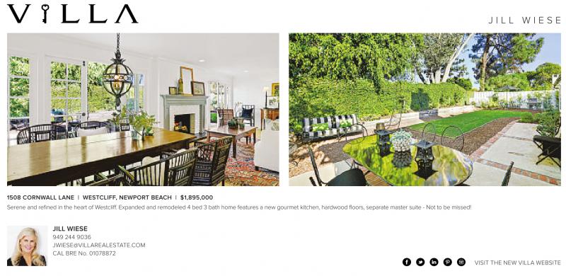 J I L L W I E S E 1508 CORNWALL LANE | WESTCLIFF, NEWPORT BEACH | $1,895,000 Serene and refined in theheartofWestcliff.Expandedand remodeled 4bed 3bath home features anew gourmet kitchen, hardwood floors, separate master suite -Not to be missed! JILL WIESE 949 244 9036 JWIESE@VILLAREALESTATE.COM CAL BRE No. 01078872 VISIT THE NEW VILLA WEBSITE
