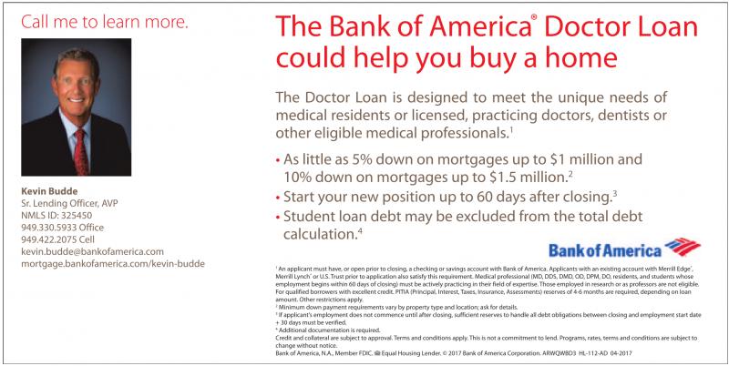 1 An applicantmust have,oropen prior to closing,achecking or savings accountwith Bank of America. Applicants with an existing accountwith Merrill Edge ® , Merrill Lynch ® or U.S. Trust prior to application also satisfy this requirement. Medical professional(MD,DDS, DMD,OD, DPM, DO,residents,and students whose employmentbegins within 60 days of closing) must be actively practicing in their field of expertise.Those employed in research or as professors arenot eligible. Forqualified borrowers with excellentcredit. PITIA (Principal,Interest, Taxes, Insurance, Assessments) reservesof4-6 months arerequired,depending on loan amount. Other restrictions apply. 2 Minimum down paymentrequirements vary by property type and location; ask fordetails.