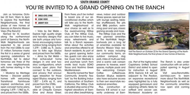 Join us tomorrow, October 22 from 10am to 4pm to explore The NorthWalk Neighborhoods, the final phase of new homes at Esencia on Rancho Mission Viejo (The Ranch)!
