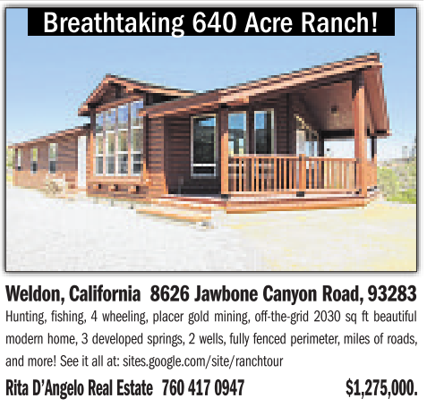 Breathtaking 640 Acre Ranch! Weldon, California 8626 Jawbone Canyon Road,93283 Hunting, fishing,4wheeling,placer gold mining,off-the-grid 2030 sq ft beautiful modern home,3developed springs, 2wells,fully fenced perimeter, miles of roads, and more! See it all at: sites.google.com/site/ranchtour Rita D’AngeloReal Estate 760 417 0947 $1,275,000.