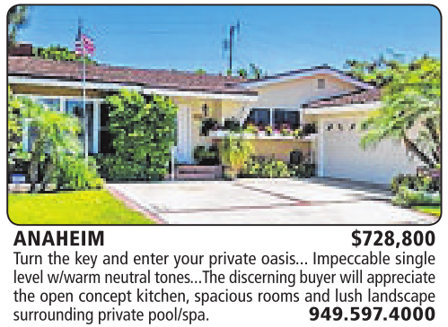ANAHEIM $728,800 Turn the key and enter your private oasis... Impeccable single level w/warm neutral tones...The discerning buyerwill appreciate the open concept kitchen, spacious rooms and lush landscape surrounding private pool/spa. 949.597.4000