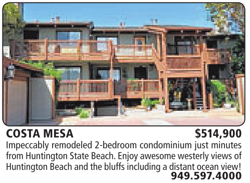 COSTA MESA $514,900 Impeccably remodeled 2-bedroom condominium just minutes from Huntington State Beach. Enjoy awesome westerly views of Huntington Beach and the bluffs including adistant oceanview!