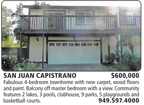 SAN JUAN CAPISTRANO $600,000 Fabulous 4-bedroom townhome with new carpet, wood floors andpaint. Balcony offmasterbedroom with aview.Community features 2lakes,3pools,clubhouse,9parks,5playgrounds and basketball courts. 949.597.4000