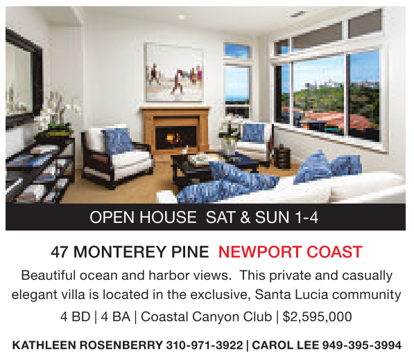 OPEN HOUSE SAT & SUN 1-4 47 MONTEREY PINE NEWPORT COAST Beautiful ocean and harbor views. This private and casually elegant villa islocated inthe exclusive, Santa Lucia community 4BD|4BA |Coastal Canyon Club |$2,595,000 KATHLEEN ROSENBERRY 310-971-3922 |CAROL LEE 949-395-3994 See also