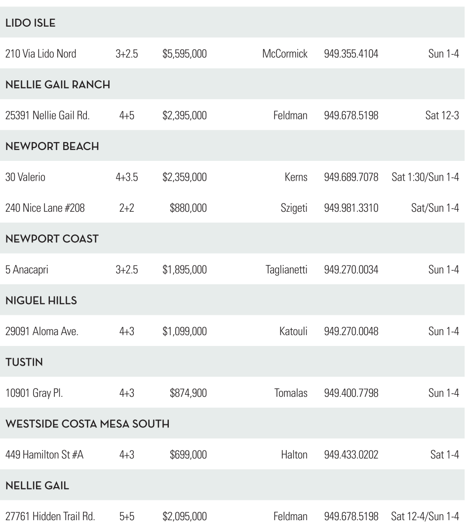 LIDO ISLE 210 ViaLido Nord 3+2.5 $5,595,000 McCormick 949.355.4104 Sun 1-4 NELLIE GAIL RANCH 25391 Nellie Gail Rd. 4+5 $2,395,000 Feldman 949.678.5198 Sat 12-3 NEWPORTBEACH 30 Valerio 4+3.5 $2,359,000 Kerns 949.689.7078 Sat 1:30/Sun 1-4 240 Nice Lane #208 2+2 $880,000 Szigeti 949.981.3310 Sat/Sun 1-4 NEWPORTCOAST 5Anacapri 3+2.5 $1,895,000 Taglianetti 949.270.0034 Sun 1-4 NIGUEL HILLS 29091 Aloma Ave. 4+3 $1,099,000 Katouli 949.270.0048 Sun 1-4 TUSTIN 10901 Gray Pl. 4+3 $874,900 Tomalas 949.400.7798 Sun 1-4 WESTSIDE COSTA MESASOUTH 449 Hamilton St #A 4+3 $699,000 Halton 949.433.0202 Sat 1-4 NELLIE GAIL 27761 Hidden Trail Rd. 5+5 $2,095,000 Feldman 949.678.5198 Sat 12-4/Sun 1-4