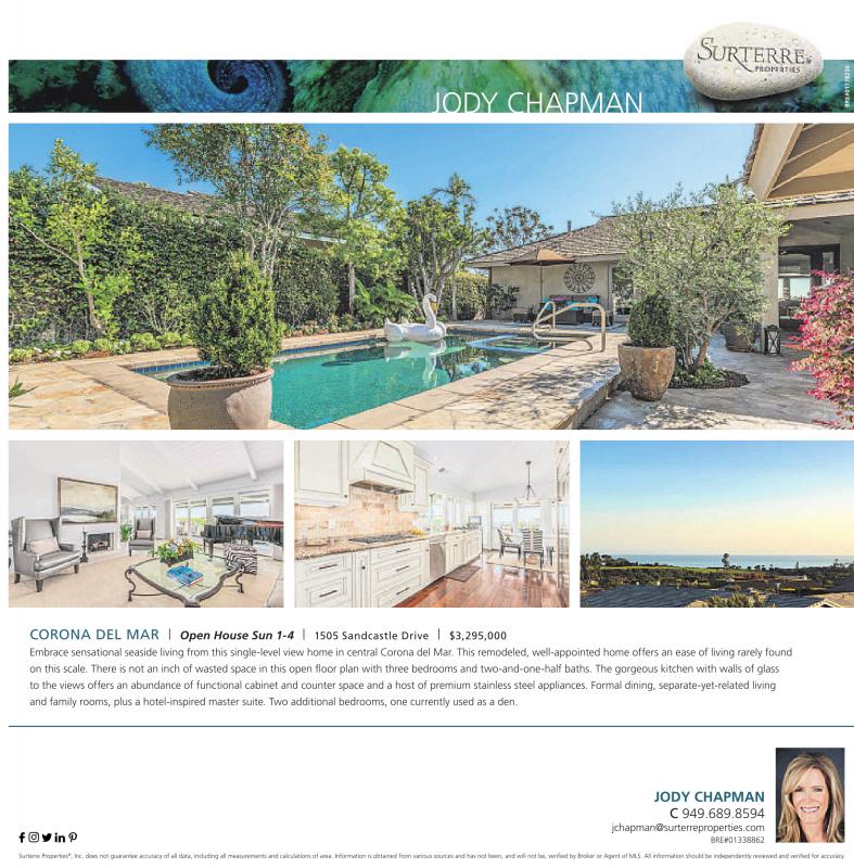 JODY CHAPMAN CORONA DEL MAR | Open House Sun 1-4 | 1505 Sandcastle Drive | $3,295,000 Embrace sensational seaside living from this single-level view home in central Corona del Mar. This remodeled, well-appointed home offers an ease of living rarely found on this scale. There is not an inch of wasted space in this open floor plan with three bedrooms and two-and-one-half baths. The gorgeous kitchen with walls of glass to the views offers an abundance of functional cabinet and counter space and a host of premium stainless steel appliances. Formal dining, separate-yet-related living and family rooms, plus a hotel-inspired master suite. Two additional bedrooms, one currently used as a den. JODY CHAPMAN C 949.689.8594 jchapman@surterreproperties.com BRE#01338862 Surterre Properties ® ,Inc. does not guarantee accuracy of all data, including all measurements and calculations ofarea. Information is obtained from various sources and has not been, and will not be, verified by Broker or Agent ofMLS. All information should be independently reviewed and verified for accuracy. See also