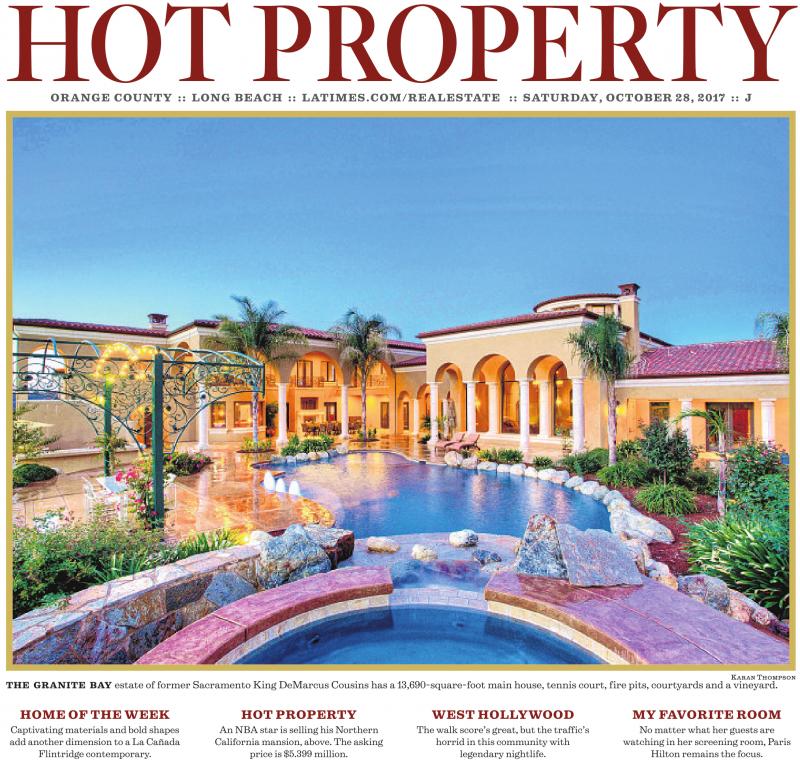 HOT PROPERT Y ORANGE COUNTY :: LONG BEACH :: LATIMES.COM/REALESTATE :: SATURDAY, OCTOBER 28, 2017 :: J Karan Thompson THE GRANITE BAY estate of former Sacramento King DeMarcus Cousins has a 13,690-square-foot main house, tennis court, fire pits, courtyards and a vineyard. HOME OF THE WEEK Captivating materials and bold shapes add another dimension to a La Cañada Flintridge contemporary. HOT PROPERTY An NBA star is selling his Northern California mansion, above. The asking price is $5.399 million. WEST HOLLYWOOD The walk score’s great, but the traffic’s horrid in this community with legendary nightlife. MY FAVORITE ROOM No matter what her guests are watching in her screening room, Paris Hilton remains the focus.