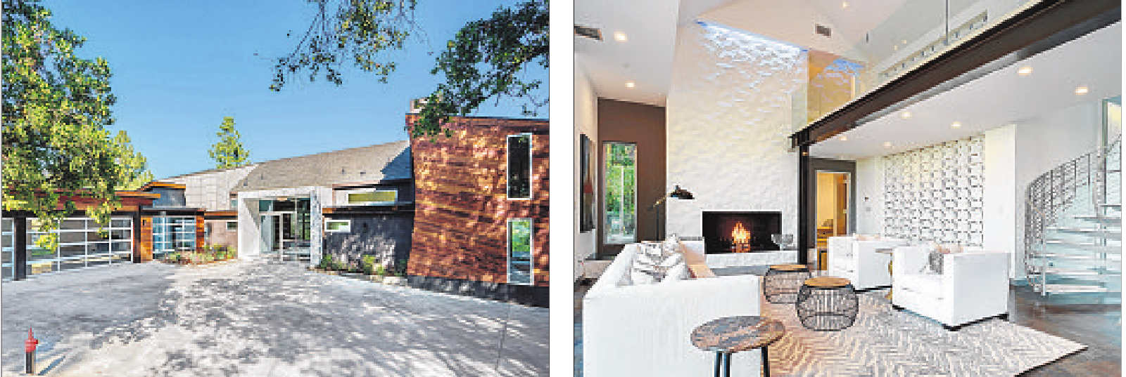 Set up from the street and beyond a weathered steel fence, this contemporary home in La Cañada Flintridge draws the eye with bold geometric forms dressed in a mix of patterns and materials.