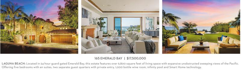 165 EMERALD BAY | $17,500,000 LAGUNA BEACH: Located in 24 hour guard gated Emerald Bay, this estate features over 6,800 square feet of living space with expansive unobstructed sweeping views of the Pacific. Offering five bedrooms with en suites, two separate guest quarters with private entry, 1,000 bottle wine room, infinity pool and Smart Home technology.
