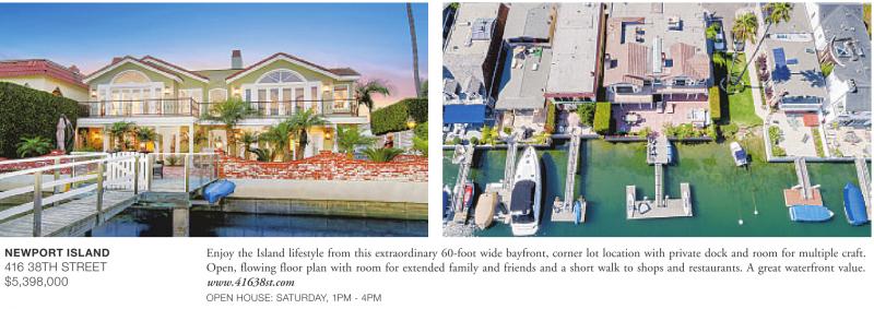 NEWPORT ISLAND 416 38TH STREET $5,398,000 Enjoy the Island lifestyle from this extraordinary 60-foot wide bayfront, corner lot location with private dock and room for multiple craft. Open, flowing floor plan with room for extended family and friends and a short walk to shops and restaurants. A great waterfront value. www.41638st.com OPEN HOUSE: SATURDAY, 1PM - 4PM
