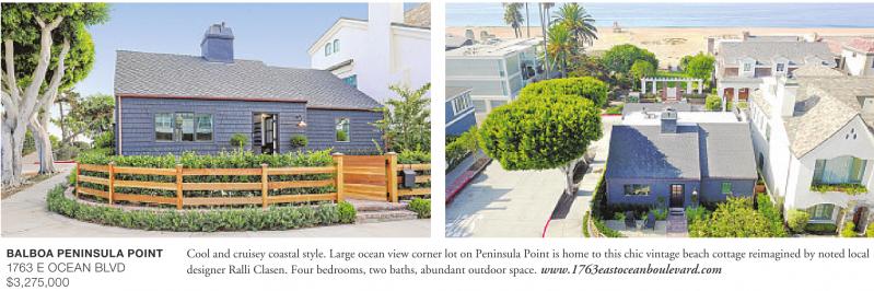 BALBOA PENINSULA POINT 1763 E OCEAN BLVD $3,275,000 Cool and cruisey coastal style. Large ocean view corner lot on Peninsula Point is home to this chic vintage beach cottage reimagined by noted local designer Ralli Clasen. Four bedrooms, two baths, abundant outdoor space. www.1763eastoceanboulevard.com