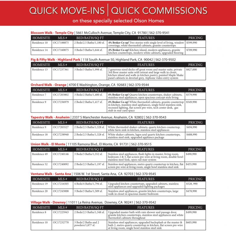 Blossom Walk -Temple City | 5661 McCulloch Avenue,Temple City, CA 91780 | 562-370-9541 HOMESITE MLS # BED/BATH/SQ FT FEATURES PRICING Residence 10 OC17188875 2 Beds/2.5 Baths/1,180 sf. 4% Broker Co-op! Two stories with single level of living, window coverings, white thermofoil cabinets, granite countertops Residence 14 OC17160075 3 Beds/3 Baths/1,644 sf. 4% Broker Co-op! Kitchen island, modern appliances, granite kitchen countertops, modern white cabinets, upgraded flooring Fig & Fifty Walk - Highland Park | 118 South Avenue 50, Highland Park, CA 90042 | 562-370-9502 HOMESITE MLS # BED/BATH/SQ FT FEATURES PRICING