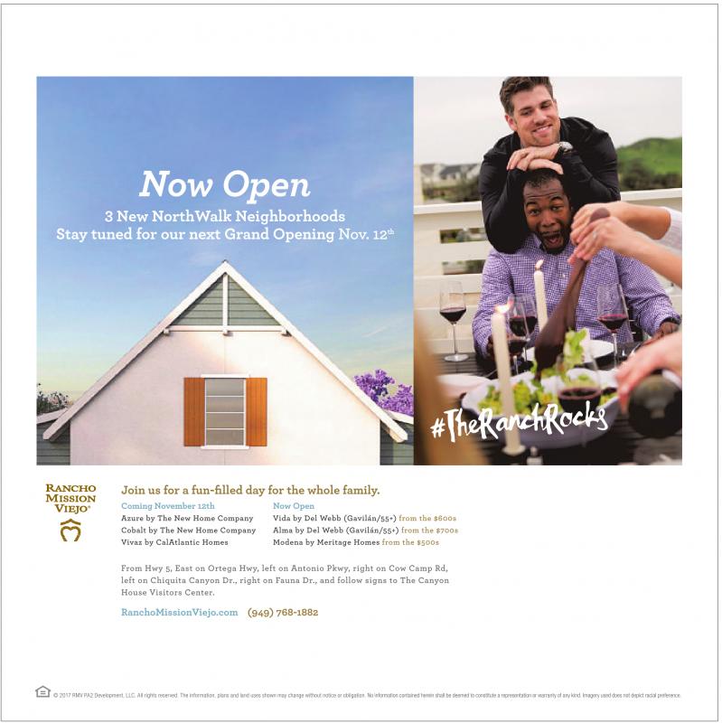 Now Open 3 New NorthWalk Neighborhoods Stay tuned for our next Grand Opening Nov. 12 th Join us for a fun-filled day for the whole family. ComingNovember 12th NowOpen Azure by The New Home Company Vida by Del Webb (Gavilán/55+) from the $600s Cobalt by The New Home Company Alma by Del Webb (Gavilán/55+) from the $700s Vivaz by CalAtlantic Homes Modena by Meritage Homes from the $500s From Hwy 5, East on Ortega Hwy, left on Antonio Pkwy, right on Cow Camp Rd, left on Chiquita Canyon Dr., right on Fauna Dr., and follow signs to The Canyon House Visitors Center. RanchoMissionViejo.com (949) 768-1882 ©2017 RMV PA2 Development, LLC. All rights reserved. The information, plans and land uses shown may change without notice orobligation. No informationcontainedherein shallbedeemedtoconstitute arepresentation or warranty of anykind. Imageryuseddoes notdepictracial preference.