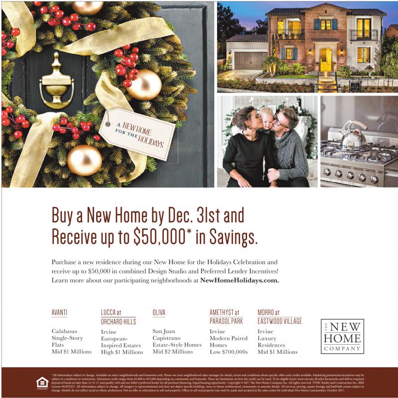 Buy a New Home by Dec. 31st and Receive up to $50,000* in Savings. Purchase a new residence during our New Home for the Holidays Celebration and receive up to $50,000 in combined Design Studio and Preferred Lender Incentives! Learn more about our participating neighborhoods at NewHomeHolidays.com. AVANTI Calabasas Single-Story Flats Mid $1 Millions LUCCA at ORCHARD HILLS Irvine European- Inspired Estates High $1 Millions OLIVA San Juan Capistrano Estate-Style Homes Mid $2 Millions AMETHYST at PARASOL PARK Irvine Modern Paired Homes Low $700,000s MORRO at EASTWOOD VILLAGE Irvine Luxury Residences Mid $1 Millions N E W HOME C O M P A N Y *All information subject to change. Availableonselect neighborhoodsand homesites only.Pleasesee your neighborhood sales managerfor details,terms andconditionsabout specificoffersand creditsavailable. Marketingpromotions/incentivesmay be subjecttoconditionsorrestrictions.Maximum credit rangesfrom $5,000 to $55,000 dependingoncommunity andhomesite. Thereare limitationsonhow thecreditcan be used.Tobeeligible buyermustexecute all sales documentsand deliverrequired deposit of funds no laterthan12-31-17 andqualifywithand useSeller’s preferred lender forall purchase financing. Equal housingopportunity. Copyright©2017 TheNew Home CompanyInc.All rights reserved.TNHCRealtyand Construction Inc., BRE License#01870227. All information subject to change. All imageryisrepresentationaland does notdepictspecificbuilding, viewsorfuturearchitectural, community or amenity details. All services, pricing, square footage and bed/bath counts subject to change.Models do notreflect racialorethnic preferences. Notanoffer or solicitationtosellrealproperty.Offerstosellrealpropertymay only be made andacceptedatthe sales center forindividual NewHomecommunities. October2017.
