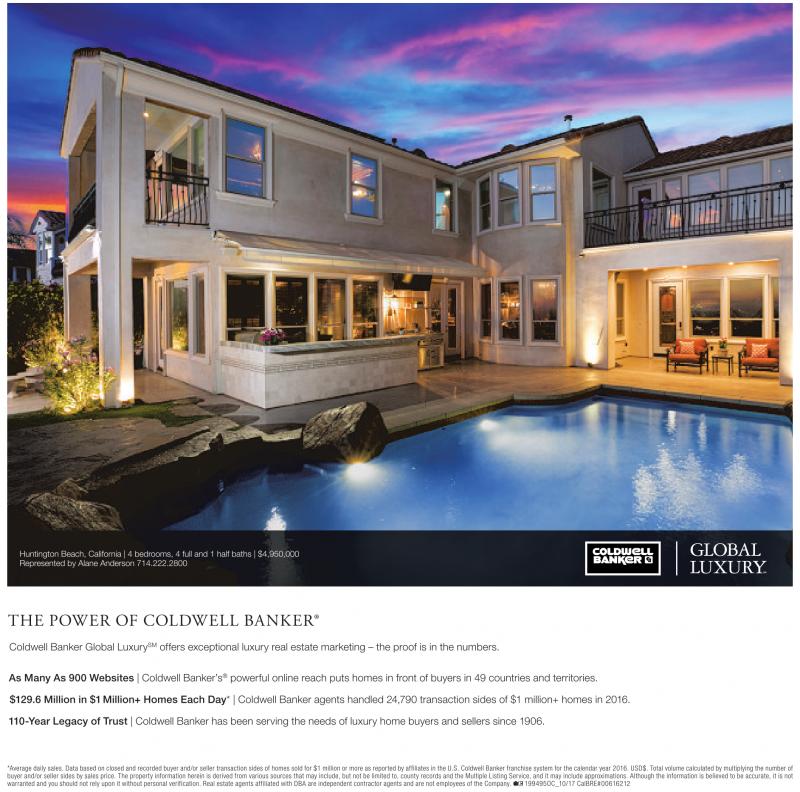 Huntington Beach, California |4bedrooms, 4full and 1half baths |$4,950,000 Represented by Alane Anderson 714.222.2800 THE POWER OF COLDWELL BANKER® Coldwell Banker Global Luxury SM offers exceptional luxury real estate marketing – the proof is in the numbers. As Many As 900 Websites | Coldwell Banker’s ® powerful online reach puts homes in front of buyers in 49 countries and territories. $129.6 Million in $1Million+ Homes Each Day* | Coldwell Banker agents handled 24,790 transaction sides of $1 million+ homes in 2016. 110-Year Legacy of Trust | Coldwell Banker has been serving the needs of luxury home buyers and sellers since 1906. *Average daily sales. Data based on closed and recorded buyer and/or seller transaction sides ofhomes sold for $1million or more asreported byaffiliates inthe U.S. Coldwell Banker franchise system for the calendar year 2016. USD$. Total volume calculated by multiplying the number of buyer and/or seller sides by sales price. The propertyinformation herein isderived from various sources that may include, but not be limited to, county records and the Multiple Listing Service, and it may include approximations. Although the information is believed to be accurate, itisnot warranted and you should not rely upon itwithout personal verification. Real estate agents affiliated with DBA are independent contractor agents and are not employees of the Company. 199495OC_10/17 CalBRE#00616212